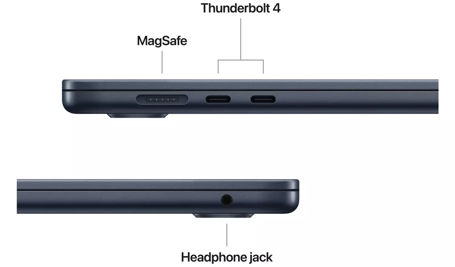 With two Thunderbolt 4 ports, MagSafe charging, a headphone jack, Wi-Fi 6E, and Bluetooth 5.3, MacBook Air lets you connect everything you need. It even supports up to two external displays.