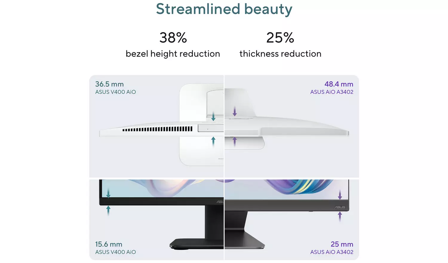 ASUS V400 AiO projects a minimalist aesthetic, with a slim, stylish design that’s perfect for modern workspaces. Even the internals are tidy, create smaller package that empowers greater expandability.